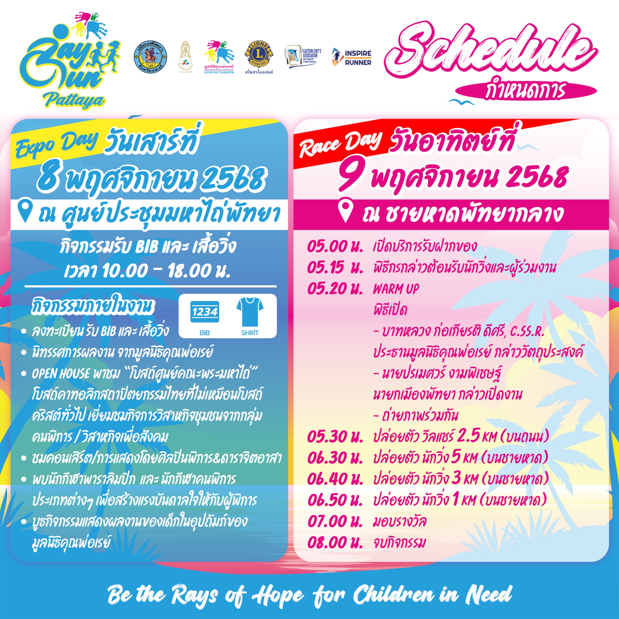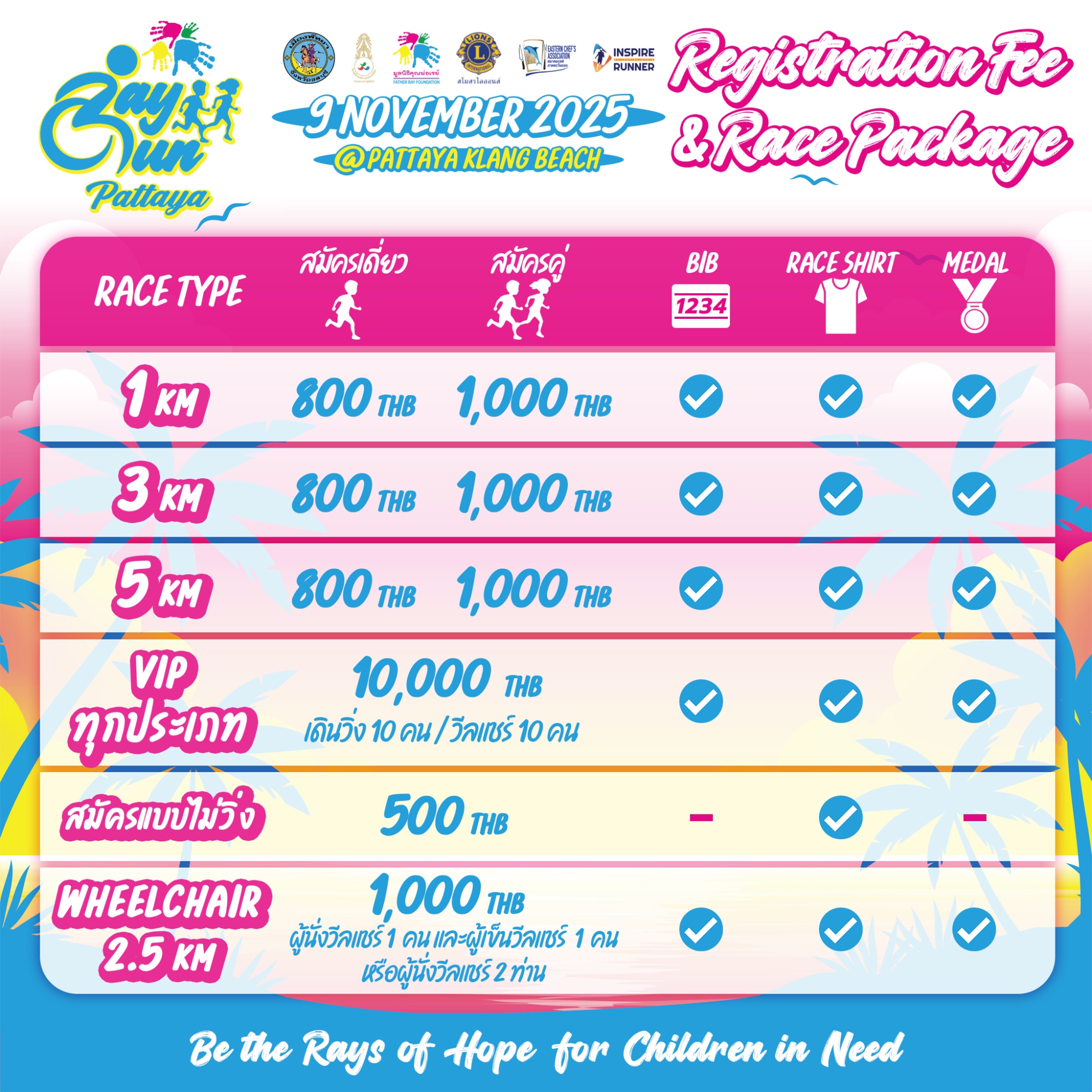 Father Ray Foundation would like to invite runners and the general public to be a part of the shining ray of hope for children in need on Sunday, November 9th, 2025 at the Pattaya beach. We are hosting our first charity beach and wheelchair run, which all proceed and donation will be contributed toward Father Ray Foundation grand purpose of providing care and educational supports to disadvantaged children and students with disability. Simultaneously, the charity run aims to champion the inspiration while encourage equal opportunity for disabled persons.